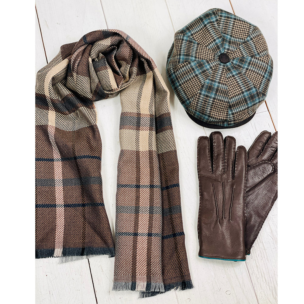 Ein hochwertiger brauner karierter Wollschal vervollständigt das stilvolle Alltagsoutfit.